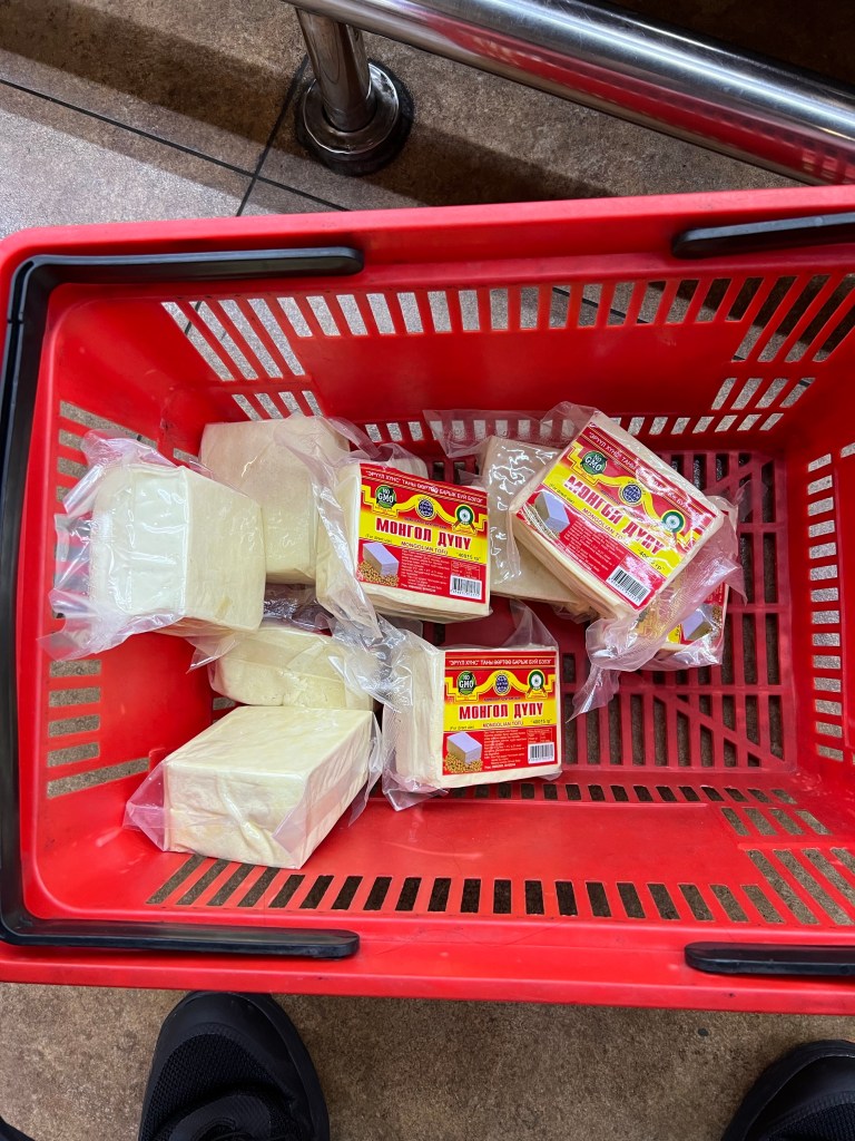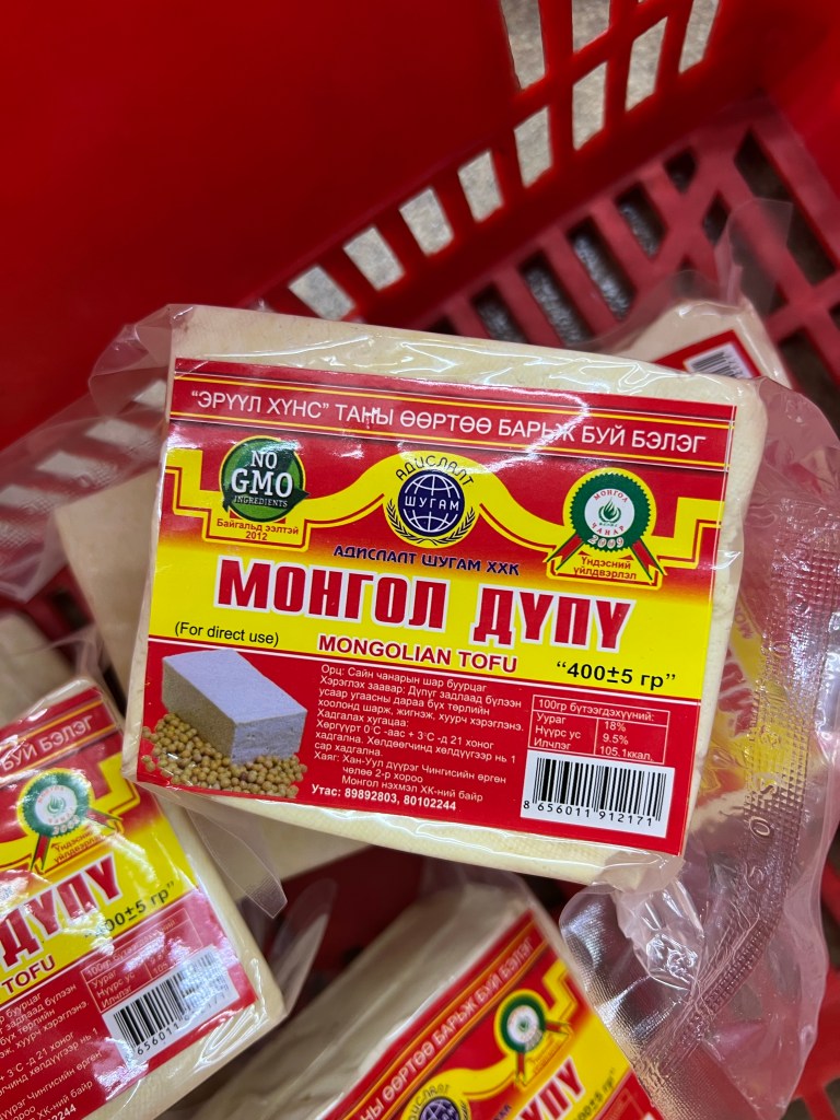 Beans were easy to find and I loaded my basket with a selection of cans of black beans, baked beans and white beans. Than came the most nervous part of my shopping experience, searching for the cooled section of shelves where, if it all possible, I may find the ever elusive tofu supplies I have been counting on. After scanning through rows and rows of dairy products, some looking very exotic and being made from sheep, goat, horse dairy, I spotted a section that looked like the so-called “alternative dairy section”. And, lo and behold, I saw the all-so-familiar rectangular shaped packs of what I thought may be tofu products. Yes! In clean letters printed on pretty link labels I saw the word “tofu”. To be precise the labels read “Mongolian tofu”, which in the moment of my joy did not phase me and I proceeded to load my basket with as many packs as I could. I knew that storage or spoilage will not be an issue, given the cold outside conditions we faced. I also knew my appetite and need for tofu in my diet is insatiable. So, I thought, what could go wrong if I just buy a bunch? The vans can carry it all. This was the first and last time I saw tofu in a grocery store in Mongolia and these packs lasted the entire trip. In hindsight I feel I made the right decision to buy all those packs, essentially emptying the shelves of that particular store. The looks people gave me as I made my way to the checkout counter with a basket full of canned beans and another full of tofu will definitely stay with me as a fun memory of the many experiences I made on my vegan journey. I was a happy man now, having just completed my hunt for vegan protein for the duration of the trip.