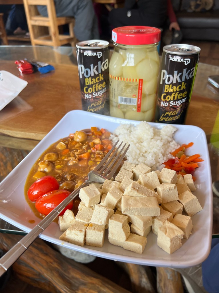 The vegetarian meals consisted mostly of noodles, rice, stir fried veggies either prepared as plated dishes or soups. All meals were calorie dense and nutritious, exactly what we needed to have enough energy to battle the cold and to have strength to complete the daily segments of our trek. I would augment these meals by asking the cooks to either cut some tofu in cubes for me or to heat up a can of beans I could eat out of the can itself. I would say this type of meal prep is somewhat similar to how I eat at home, so I was a happy man throughout the trip.