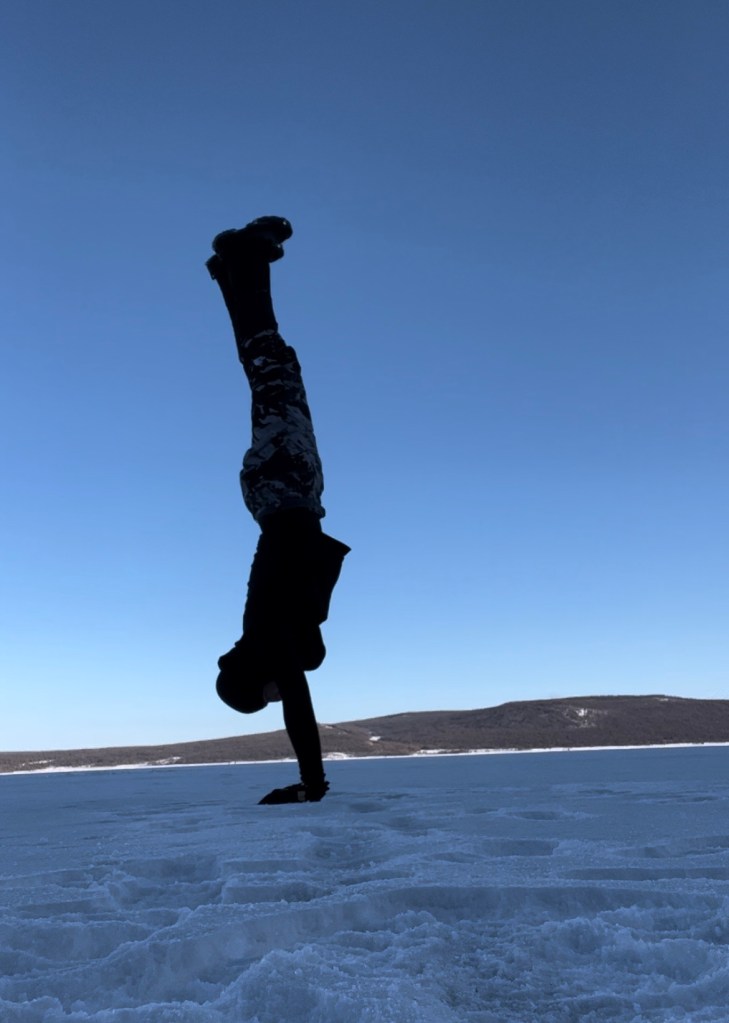 xvii. Braving the cold to do some handstands. On the main road in front of Hotel 365 and on the packed snow on the lake itself. Fun but it was too cold. And trying this on snow turned out to be a but dangerous. Luckily I escaped any major injuries. And I still love handstands.